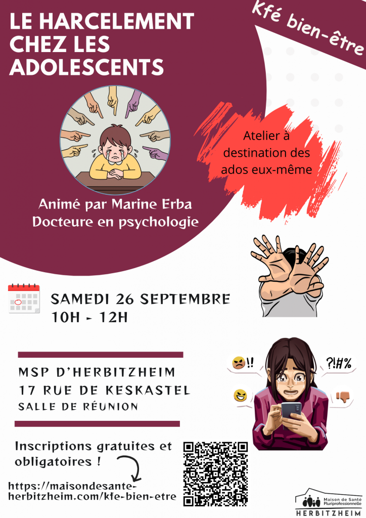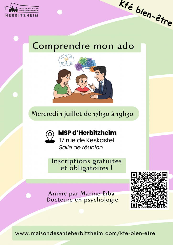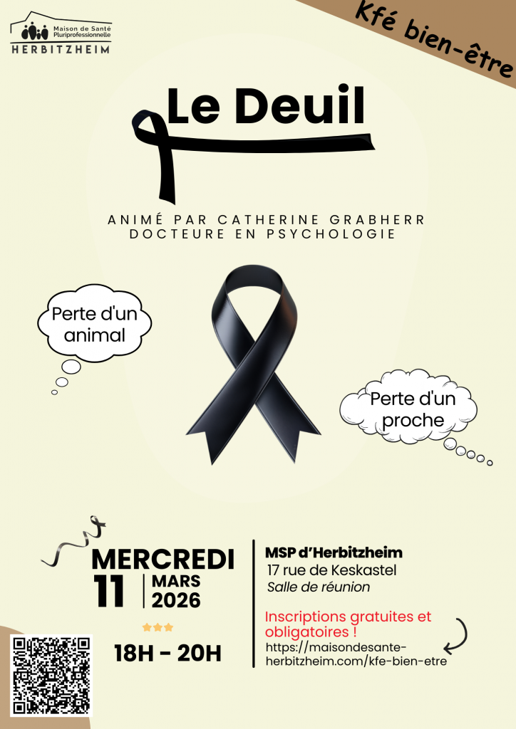 La maison de santé organise, en partenariat avec une équipe patients pilote, une série de Cafés Bien-être aussi appelés « Kfé Bien-être ». Voici ci-dessous, les dates des prochaines sessions ainsi que les liens d’inscriptions : Le deuil : 11 mars 2026 de 18h à 20h Inscriptions ICI Comprendre mon ado : 1er juillet 2026 de 17h30 à 19h30 Inscriptions ICI La solitude : 9 décembre 2026 de 18h à 20h Inscriptions ICI La ménopause : 19 mai 2026 de 18h à 20h Inscriptions ICI Le harcèlement chez les ados : 26 septembre 2026 de 10h à 12h Inscriptions ici Le sommeil : 18 juin 2026 de 18h à 20h Inscriptions ICI L’épuisement : 7 octobre 2026 de 18h à 20h Inscriptions ici Vous devriez également aimer Permanences Prises de Sang novembre 16, 2021 Bien dans ma tête, bien dans ma peau: ateliers pratiques pour une meilleure santé cardiovasculaire novembre 21, 2024 Pôle APSA Jeunes – surpoids/obésité novembre 16, 2021