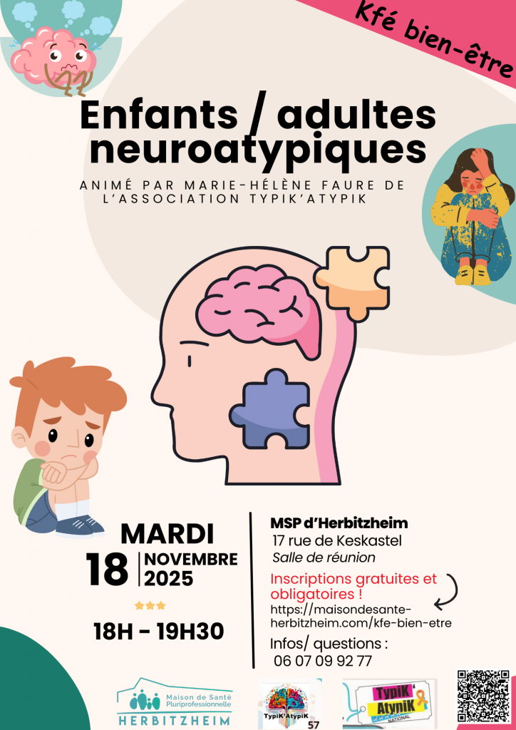 La maison de santé organise, en partenariat avec une équipe patients pilote, une série de Cafés Bien-être aussi appelés « Kfé Bien-être ». Voici ci-dessous, les dates des prochaines sessions ainsi que les liens d’inscriptions : La ménopause : 7 octobre 2025 de 18h à 20h Inscriptions ici Enfants et adultes neuroatypiques : 18 novembre 2025 de 18h à 19h30 Inscriptions ICI Vous devriez également aimer Ado Form mai 5, 2025 Profitez du forfait Diététicien-Psychologue ! novembre 28, 2020 Ateliers cuisine Parents-Enfants juillet 19, 2024